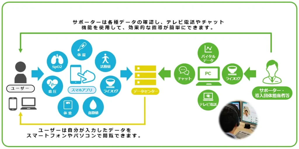 自身の健康管理をアプリやWebで進められるほか、サポーターサービスと連携して健康管理のサポートを受けることができるサービスです。